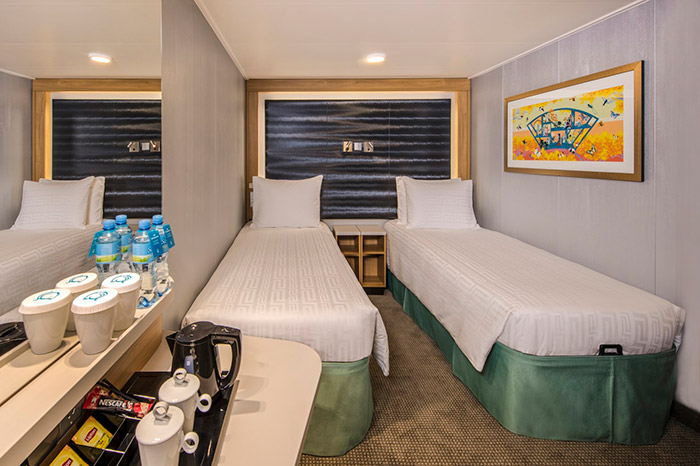 フロア面積:13㎡~ 最大定員:2 – 4名 デッキ : 5/8/9/10/11/12/13/15 シングルサイズベッド2台 /シングルサイズベッド2台+プルマンベッド /シングルサイズベッド1台+ダブルサイズソファベッド+プルマンベッド